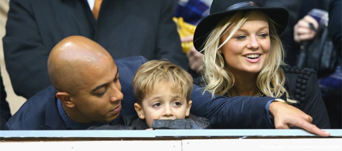 Emma Bunton assistiu o jogo de futebol de Chelsea x Manchester City acompanhada pelo seu noivo Jade Jones e ele seu filho Beau.